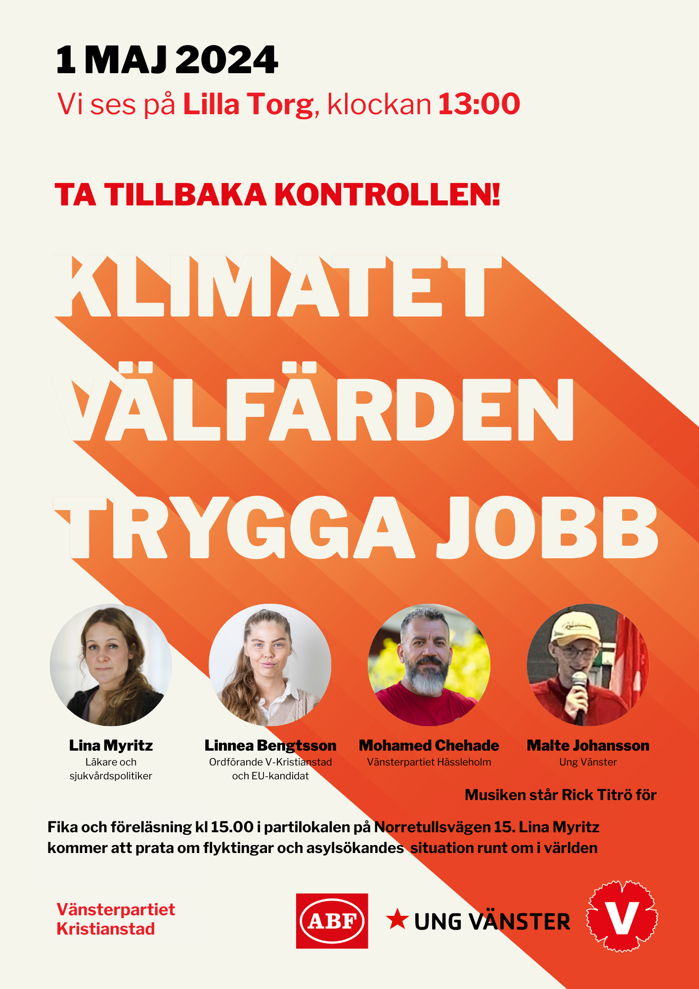 Klimataktivister. Feminister. Palestinavänner. Socialister. Äntligen är det första maj igen. Vår stora högtidsdag. Jag heter Linnea Bengtsson, ordförande för Vänsterpartiet Kristianstad och en av kandidaterna till EU. Många här i dag har säkert firat och demonstrerat på första maj längre än vad jag har levt. Några har kanske vågat sig hit för första gången medan vissa står nyfikna en bit bort och undrar vad det är för jippo i stan. Ni är alla välkomna hit idag.