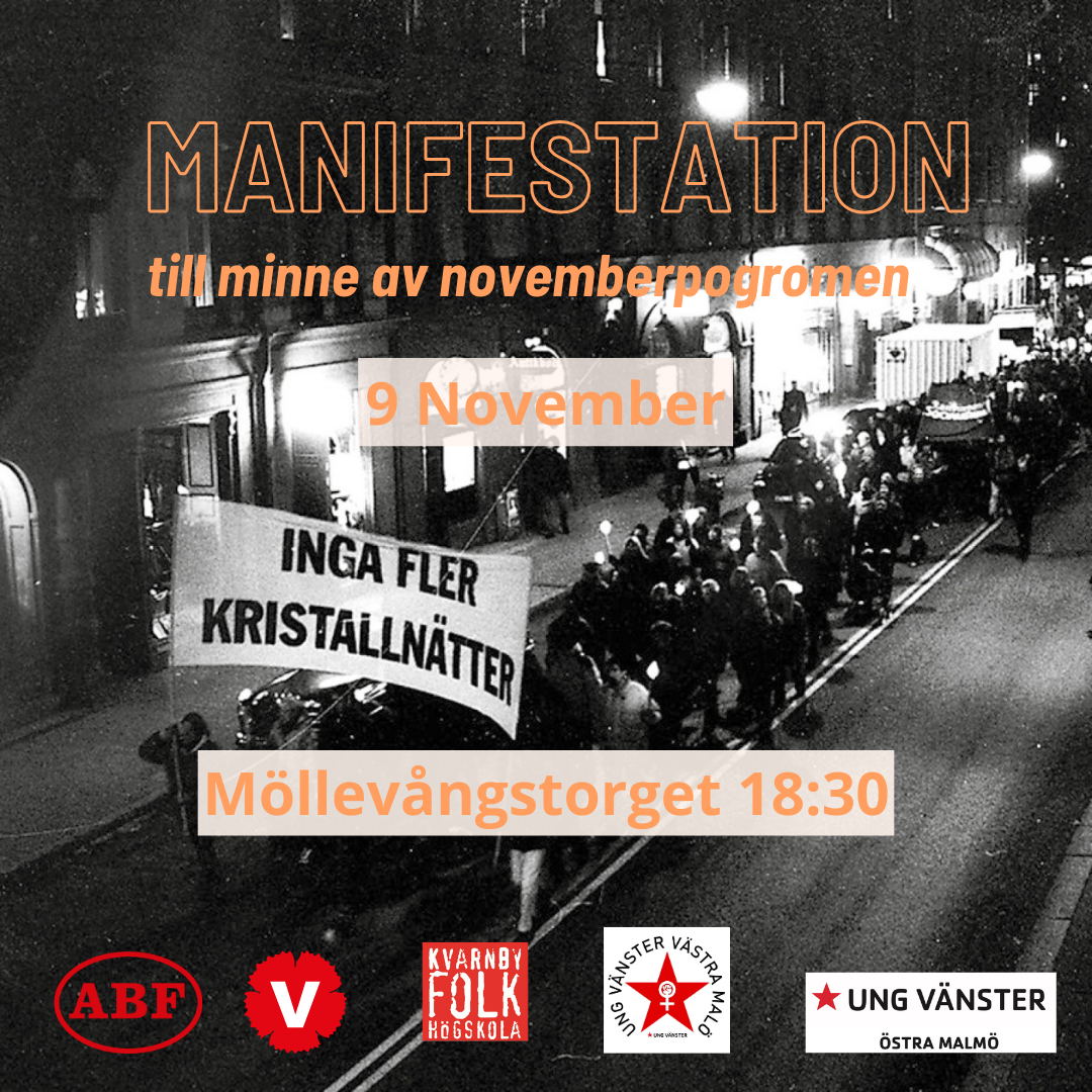 Novemberpogromerna pågick mellan 7-13 november 1938 och nådde sin kulmen natten mellan 9-10 november då hundratals judar mördades av SA, Hitlerjugend och av civila. Många tvingades begå självmord och veckorna efter greps cirka 30 000 judar och skickades till koncentrationsläger, cirka 260 synagogor brändes ner och cirka 7500 butiker och judiska hem vandaliserades. Vi står här idag för att minnas och hedra offren.